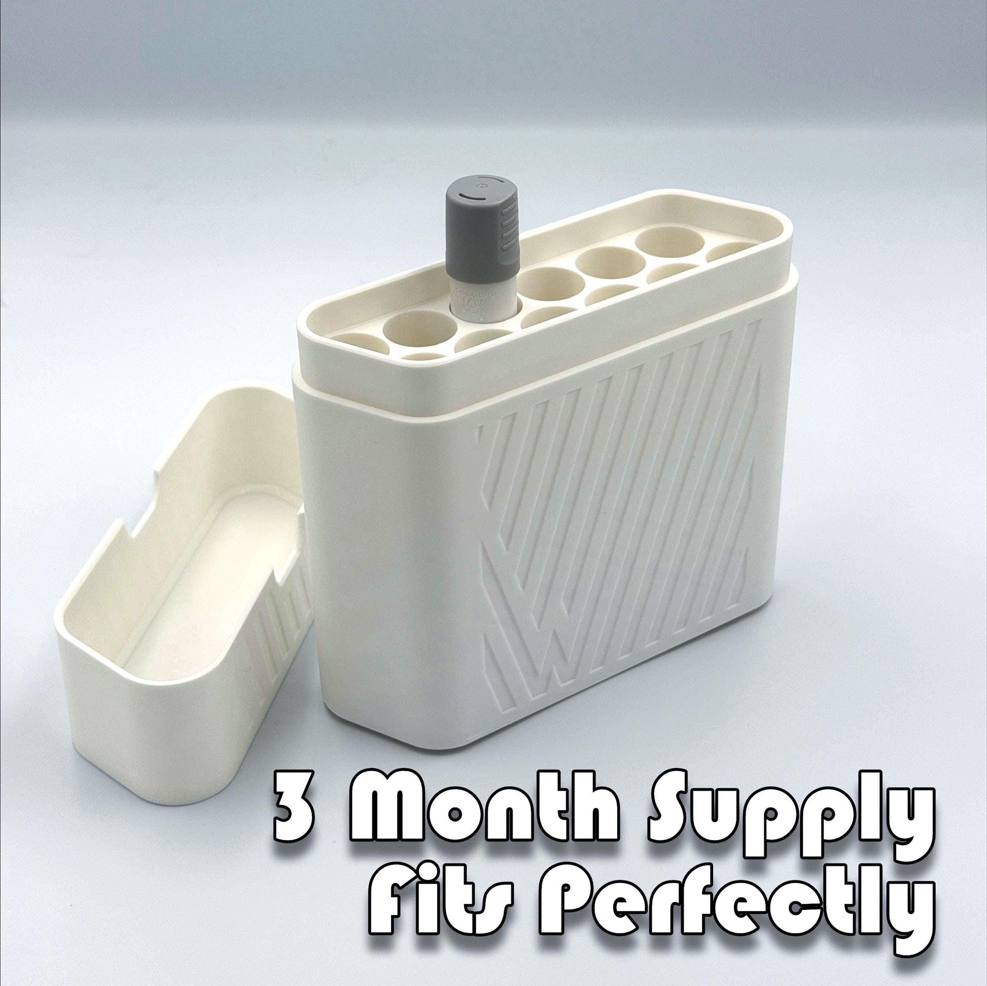 Designed to hold up to 12 pens (commonly a three-month supply)