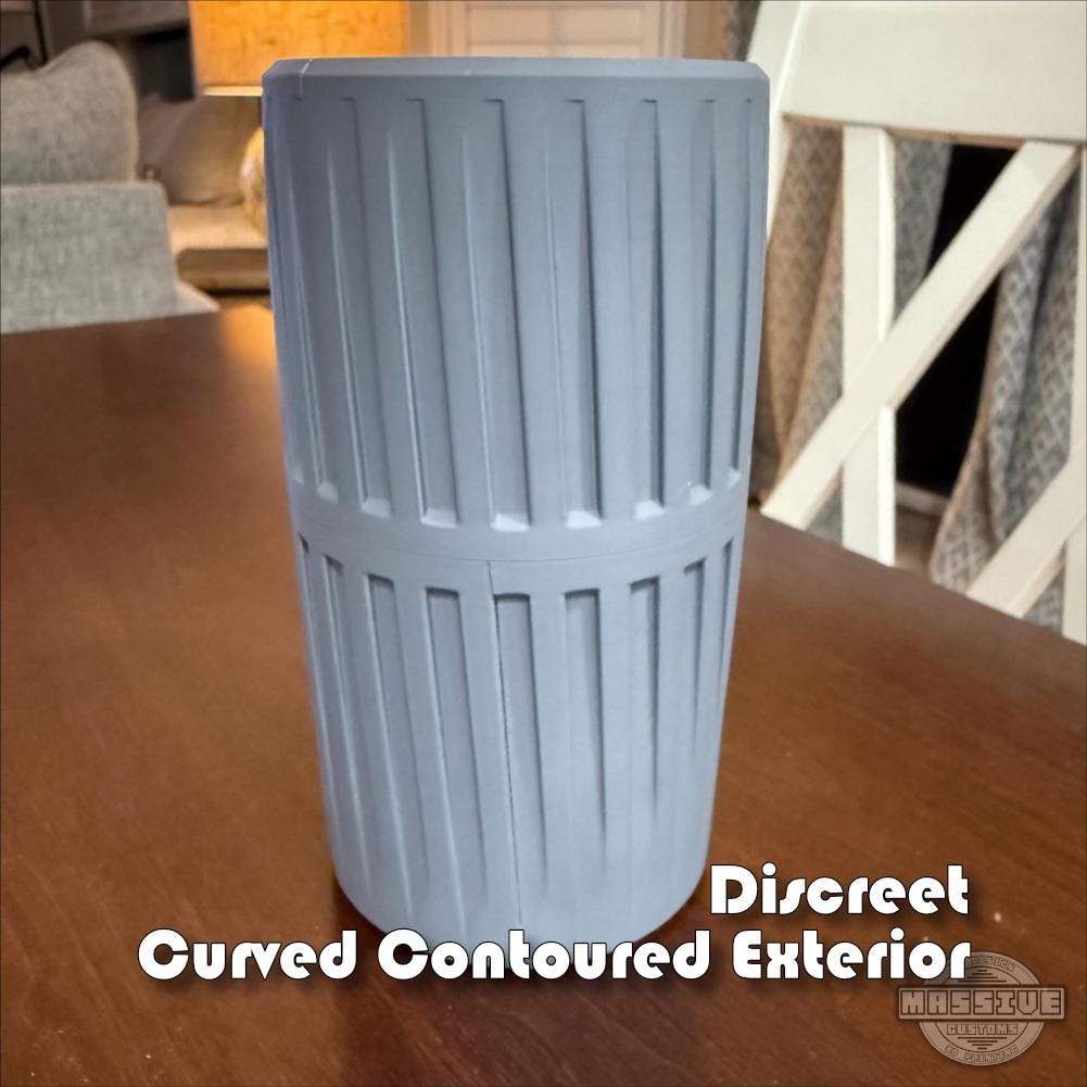 With a slim vertical footprint and a secure threaded lid, this case offers an organized, discreet alternative to loose packaging or cardboard boxes.