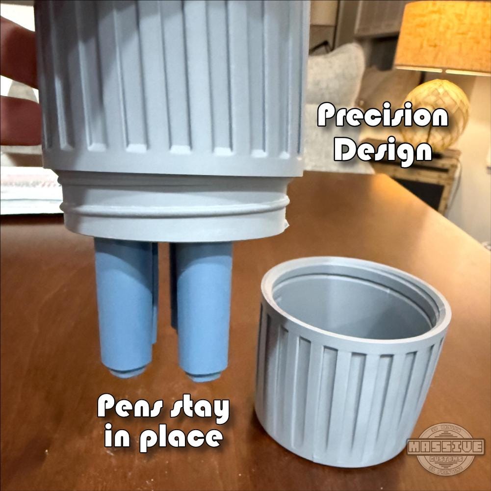 Threaded screw-on lid helps keep pens contained